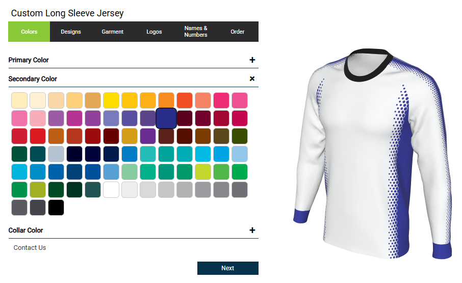 Our uniform design software allows you to choose from hundreds of designs, customize colors, and add logos, names & numbers in various styles!